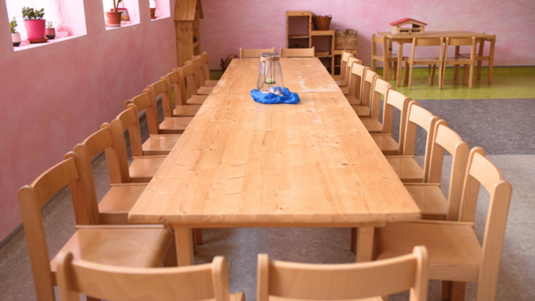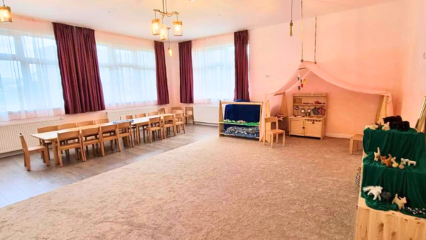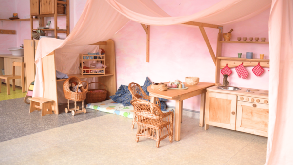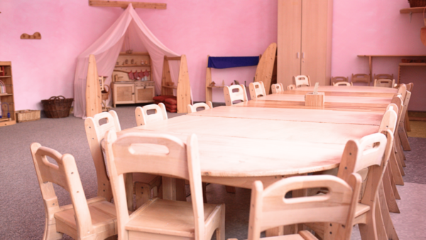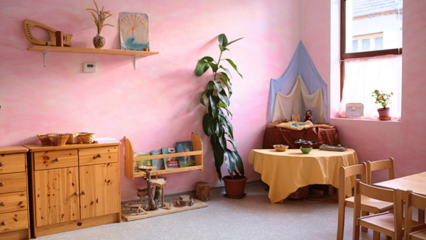 Sala de clasă într-o grădiniță Waldorf este întotdeauna plină de culoare și viață. Pereții sunt adesea lazurați în culori pastelate, pentru a stârni imaginația copiilor și pentru a crea o atmosferă prietenoasă. Elementele decorative sunt de obicei naturale, precum flori proaspete sau materiale textile din lână, care aduc o simplitate și caldură în încăpere.