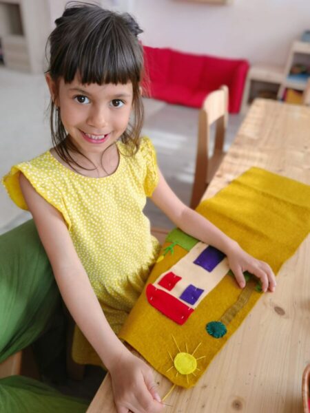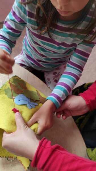 Fiecare copil desenează un copac și o căsuță și alte elemente pe care și le dorește, iar apoi din fetru de lâna colorat se decupează aceste elemente și se cos rând pe rând cu migală. trăistuța de școlar este un proces complex și de durată care implică multă răbdare, concentrare, determinare și atenție și ne arată că putem duce un proces până la capăt.